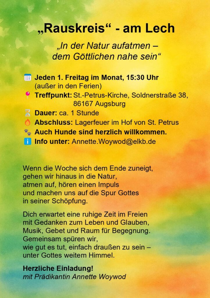 - Sie geben uns eine kurze Rückmeldung ans Gemeindebüro in der Soldnerstraße 38a, 86167 Augsburg, Tel. 712917, pfarramt.st-petrus.a@elkb.de und bekommen dann auch weiterhin den Gemeindebrief ausgetragen oder per Post zugeschickt.
